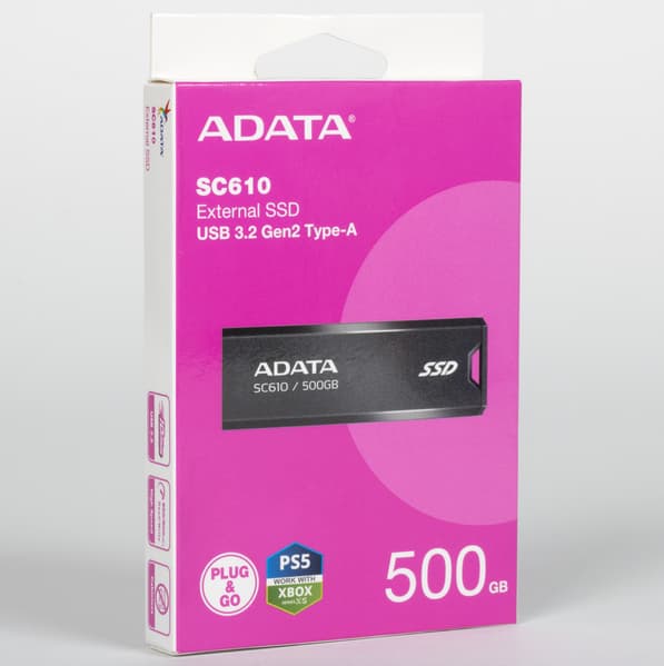 Корпус здесь в полном смысле слова флэшечный — сама Adata выпускает массу таких вот пластиковых слайдеров с интерфейсом USB 3.0 и даже USB 2.0, а некоторые линейки достигают и емкости 512 ГБ, напрямую пересекаясь с героем тестирования на этом значении, но практически всегда при чуть более высокой цене. А если нужно дешево и компактно получить 1 или 2 ТБ — то это уже только к SC610. Которого при прямом сравнении лишь немного выдают чуть-чуть бо́льшие размеры — 67×24×10 мм при массе 13 г. Для сравнения: UV128 той же емкости представляет собой аналогичный слайдер, но 60×20×9 мм и 9 г. Заметить разницу можно, только положив их друг рядом с другом. Но спецификации различаются принципиально, равно как и сроки гарантии, и цены — и по всем пунктам не в пользу обычных флэшек.