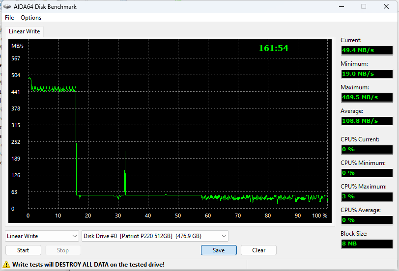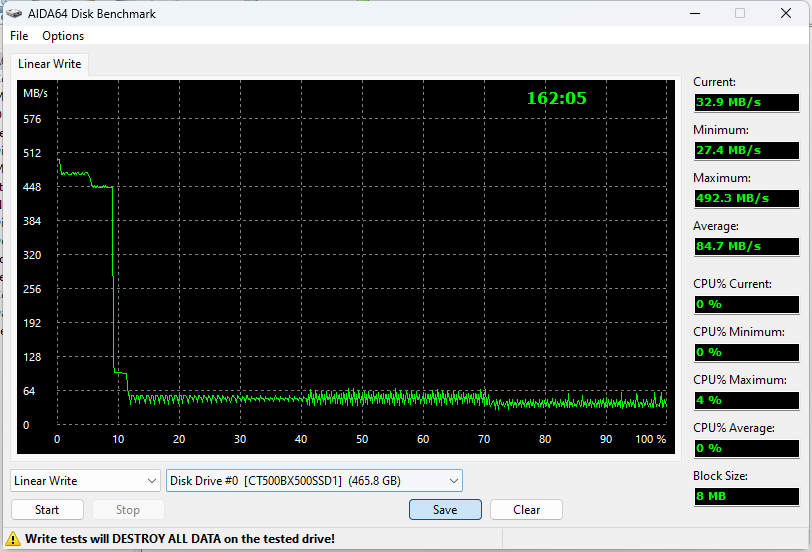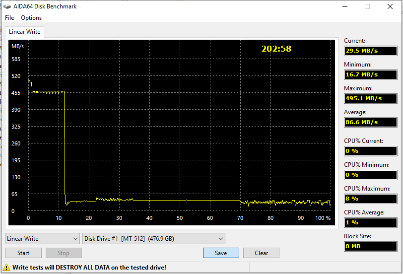 Максимальная скорость записи в кэш — около 500 МБ/с, но достигается на совсем уж маленьком участке (чисто под CrystalDiskMark). Под кэш уходят не все ячейки, но его размер превышает 20% свободного места, что более чем приемлемо. Собственную скорость записи в память приемлемой назвать сложно, но и неожиданной — тоже: QLC же. Для записи больших объемов информации эти 60 МБ/с, естественно, не подходят. На всё про всё ушло чуть больше полутора часов. Какой-нибудь Crucial MX500 той же емкости укладывается в 20 минут. Дальнейшие комментарии, казалось бы, не нужны, но...
