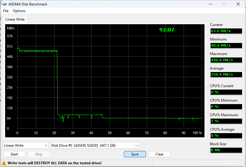 Внутренний пессимист считает, что хуже уже не будет, а оптимист радостно утверждает, что будет — и еще как будет. Похоже на предыдущий случай, но SLC-кэш меньше и медленнее (за исключением маленькой статической области — как обычно), да и за его пределами скорость записи уже не превышает 50 МБ/с, частенько проваливаясь и до 20. У SU630, напомним, 60 — и лишь изредка до 40. Общий итог — два часа сорок минут всё на те же несчастные полтерабайта.