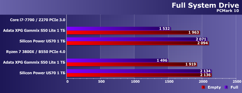 В общем, отдельный материал, посвященный PCMark 10 Storage, на подходе. В рабочий цикл мы программу, фактически, уже ввели — очень интересна в качестве комплексной оценки потребительских характеристик. Определенная база результатов уже накопилось, а сегодня мы к ней добавим еще одно устройство: на двух платформах и в двух состояниях — на пустом устройстве и заполненном на 90% (т. е. когда свободного места остается лишь 100 ГБ).