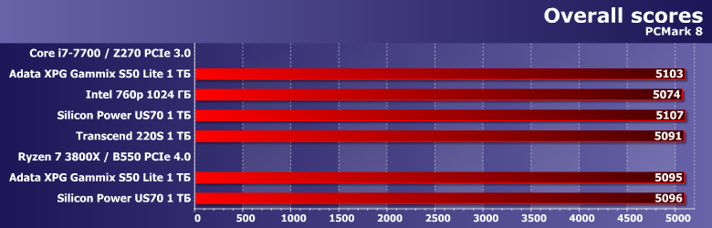 Оба условно новых SSD набрали более 5100 баллов, старые — менее, но в целом результаты у всех практически одинаковые. По не раз озвученной причине — все-таки эта версия тестового пакета разрабатывалась в основном во времена жестких дисков, так что «различать» последние — умеет, отличить их от твердотельного накопителя — тоже, а вот как-то «сортировать» последние — не очень. Слишком уж легкие нагрузки. Впрочем, как и вообще свойственно типовым «системным».