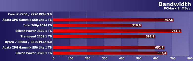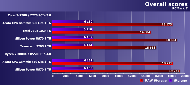 Предыдущая версия пакета придерживается того же мнения. Единственное, на что стоит обратить внимание — в RAW-режиме (т. е. когда тестируется только накопитель — без учета влияния других компонентов системы) Silicon Power US70 на переход на PCIe 4.0 «реагирует» на порядок сильнее, чем Adata XPG Gammix S50 Lite.