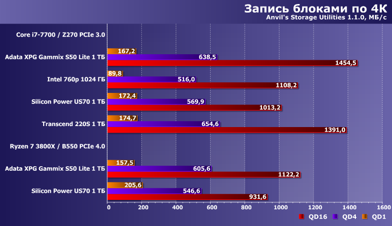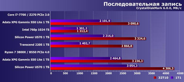 С записью же все было неплохо (во многом — благодаря агрессивному SLC-кэшированию, но как бы не болела — лишь бы померла), а стало еще лучше.
