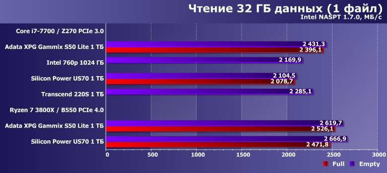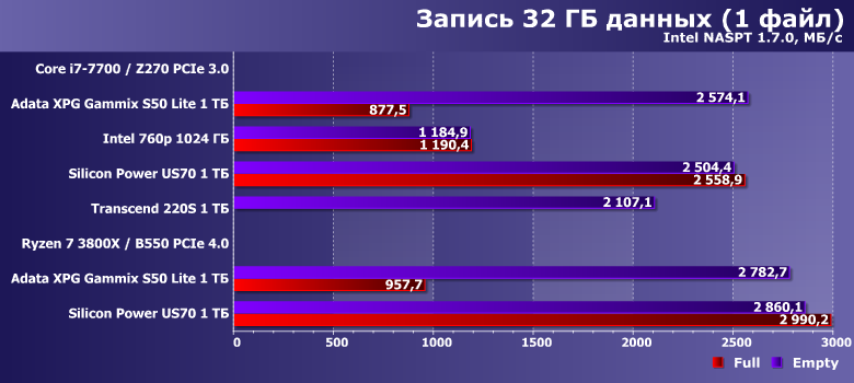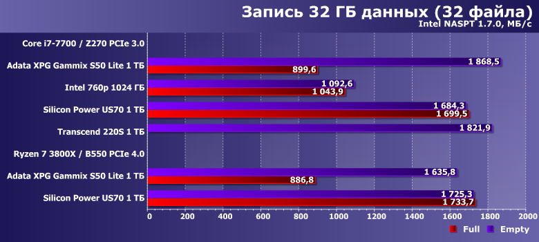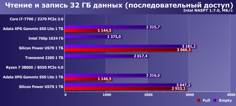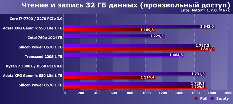 В целом — ничего неожиданного. Старую платформу Intel тест «любит» больше, чем новую AMD — но при прочих равных. Поддержка PCIe 4.0 теми SSD, который ей могут нормально воспользоваться, способна и это скомпенсировать, и еще немного улучшить показатели. Adata XPG Gammix S50 Lite пользу из PCIe 4.0 извлечь не может — поэтому только немного замедляется в циферках. И в заполненном состоянии производительность падает. Т. е. с результатами других тестов все коррелирует идеально — и верно все сказанное выше.