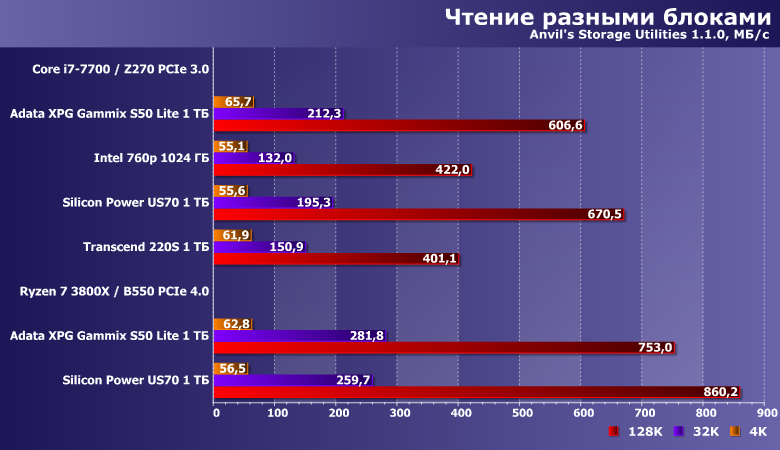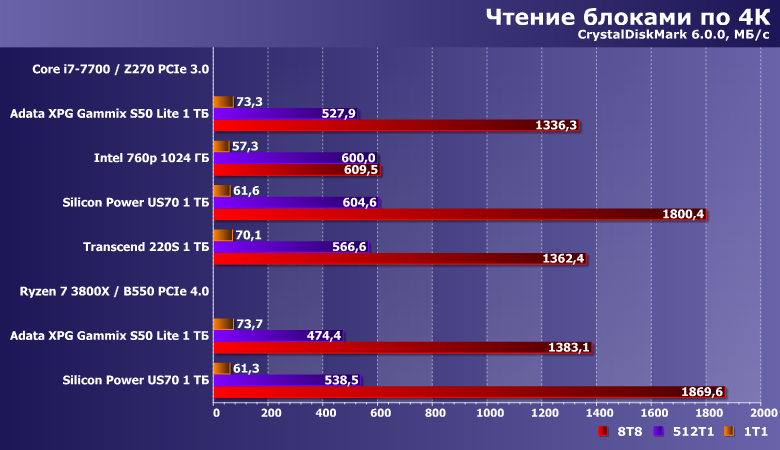 При увеличении размера блока (что актуально для программного обеспечения) результирующая производительность растет — и вот тут-то разница между PCIe 3.0 и 4.0 какая-никакая есть. Хотя для таких абсолютных скоростей хватило бы и вовсе одной линии 3.0 — но, как видим, не только лишь в теоретической пропускной способности дело иногда. Но и разница — невелика: и без нее можно было бы обойтись.