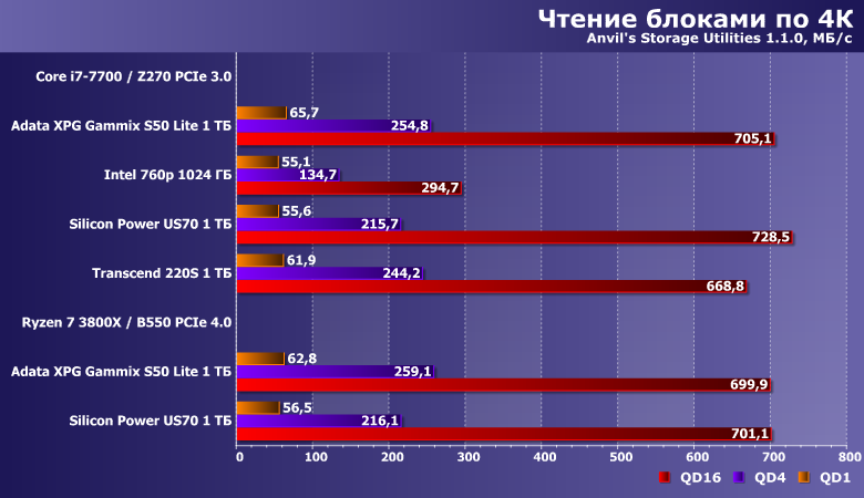 На средних очередях ситуация аналогичная — просто разница между испытуемыми меньше. При этом специфика операций такова, что пропускная способность интерфейса здесь роли не играет — на деле «хватало» бы и пары линий PCIe 3.0. Очередной намек на то, что скорости, вообще-то, бывают разными — очень сильно зависят от того, что именно делается. А производители, что естественно, из всего набора всегда выбирают самые «красивые» значения. Не важно — насколько таковые применимы к практике. Для нее, вон, важно «случайное» чтение 4К без очереди — но как раз эту цифру (хоть в мегабайтах, хоть в «йопсах») вы почти никогда в ТТХ не увидите: слишком уж маленькая :) Разве что Intel при продвижении Optane не забывает упомянуть выдающиеся результаты в этой дисциплине — так они там и правда выдающиеся.