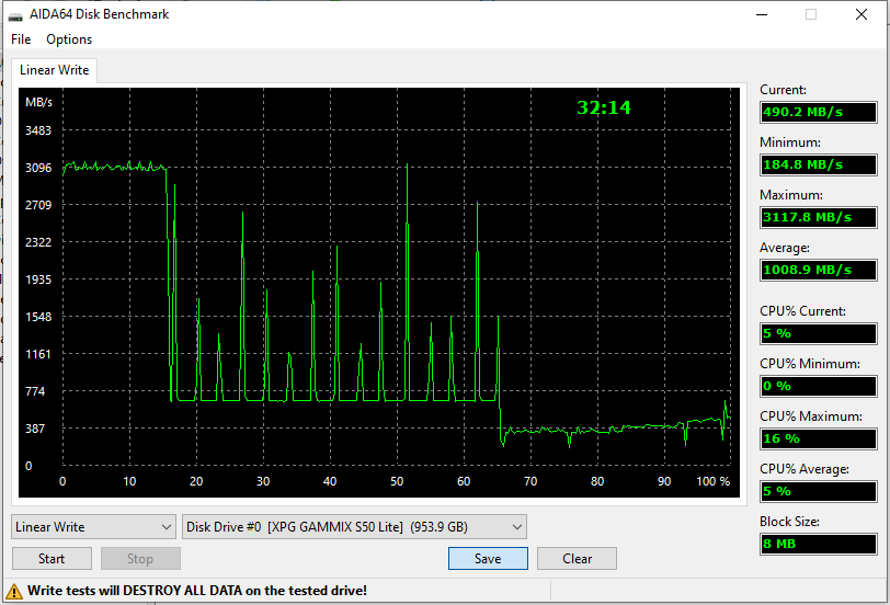 Та же картина. А вот претензии по поводу «бумажной» поддержки PCIe 4.0 ослабевают — как видим (в очередной раз), при записи больших объемов данных она ничего и Phison E16 не давала. Потому, что тут не в контроллере дело. Точнее, не только в контроллере — флэш-память не такой уж и быстрый носитель. Нет, разумеется, «разнести» вдребезги и пополам жесткие диски удалось быстро и не напрягаясь, более быстрые, чем SATA, интерфейсы на практике освоить — тоже, но до «выжимания» многих гигабайтов в секунду на записи даже в простых сценариях еще далеко. Тем более, что борьба за себестоимость вообще тянет SSD-индустрию совсем в обратном направлении: остались бы на MLC, так все бы получилось. Правда и купить подобный терабайтник даже сейчас было бы многим не по средствам — в отличие от.
