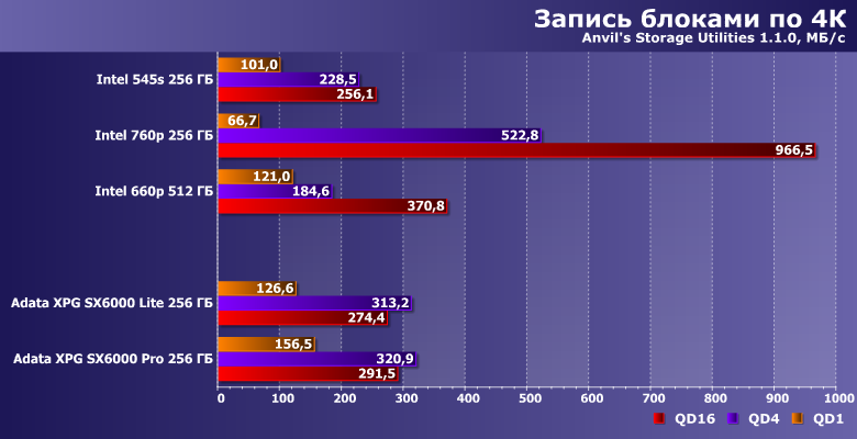 Запись же всем дается похуже — в этих случаях недорогие NVMe-накопители невысокой емкости не всегда превосходят теоретические возможности SATA. С другой стороны, недорогие SATA-устройства невысокой емкости от них еще дальше — и всегда с «нижней стороны». Забавнее здесь то, что оба накопителя Adata способны работать быстрее, чем более дорогие модели Intel.