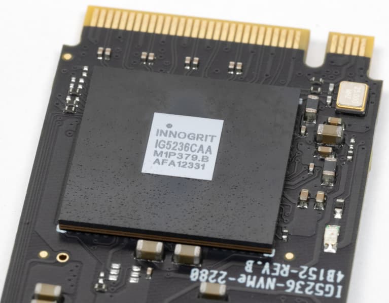 На тыльной стороне еще один чип DRAM и два — с флэш-памятью. Внешность типичная для SSD на InnoGrit IG5236 независимо от конкретной памяти, что неудивительно — ничего тут особо не оптимизируешь.