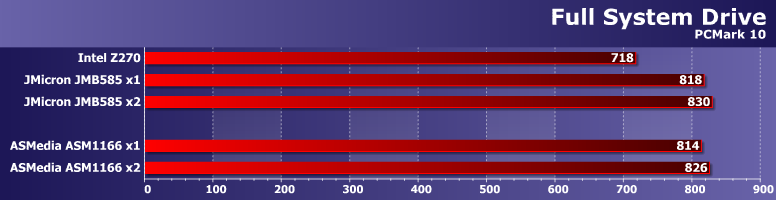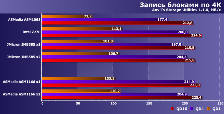 Результаты приводим просто для ознакомления — понятно, что в первую очередь они определяются используемым SSD. Но хорошо заметно, что ASM1061 может и на них сказаться — отрицательным образом. А вот новые контроллеры местами даже быстрее чипсетного, во что несколько лет назад сложно было бы поверить.