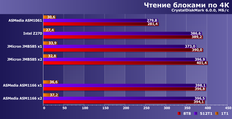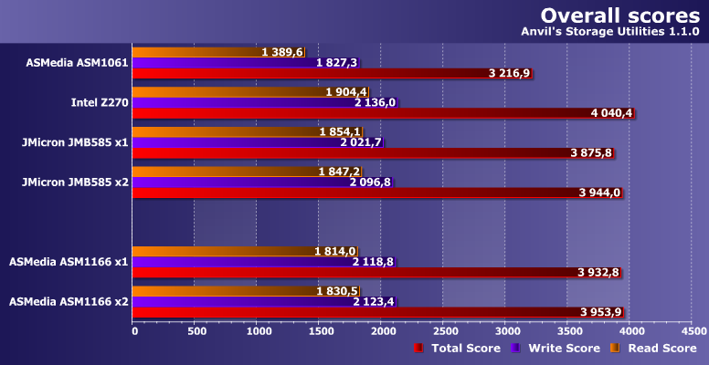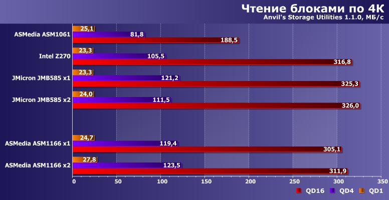 Хотя в целом по совокупности с точки зрения низкоуровневых показателей Z270 все-таки быстрее наших главных героев. Но не существенно — можно считать, что все равноценны. Так что с нехваткой портов что ASM1166, что JMB585 справляются отлично — и ничему не мешая.