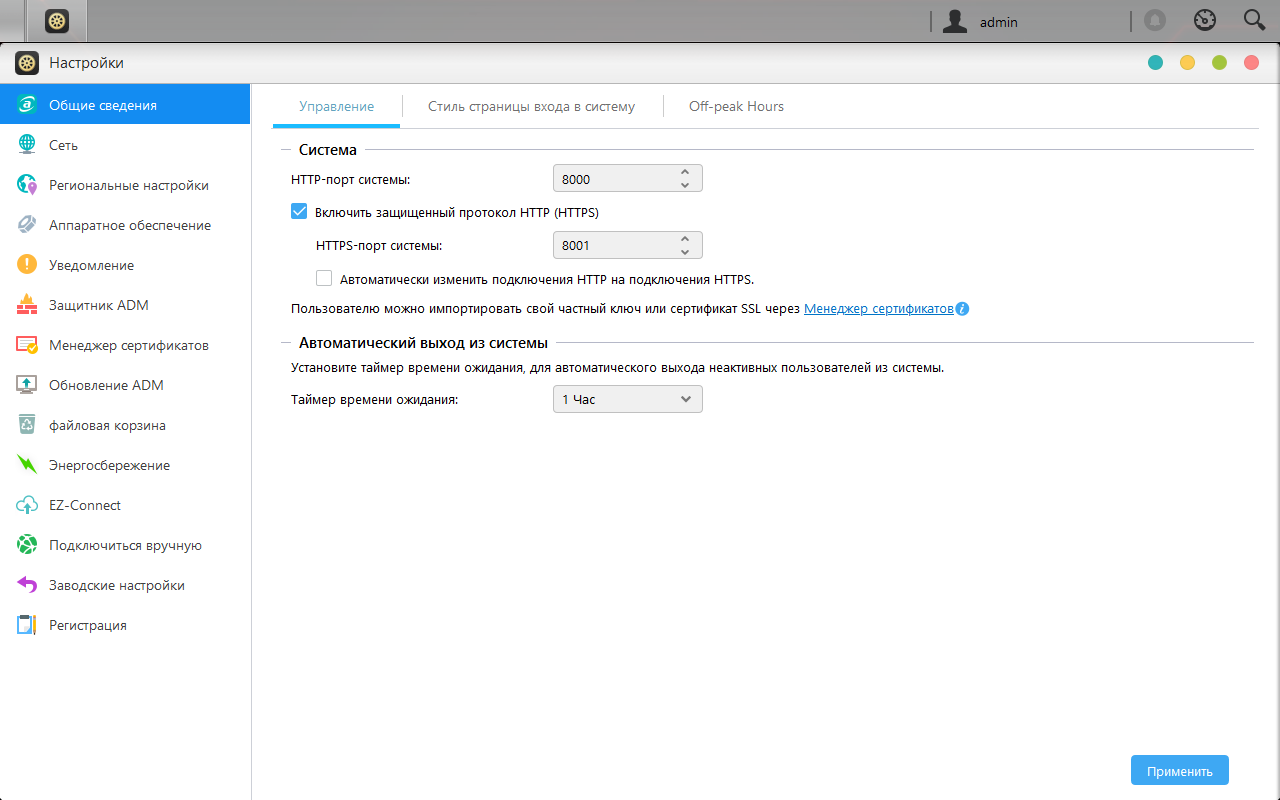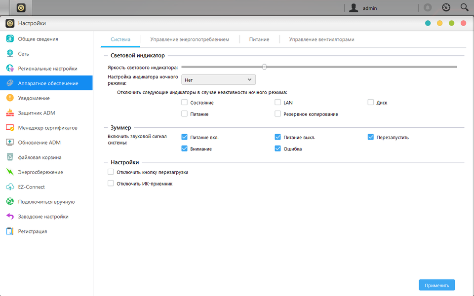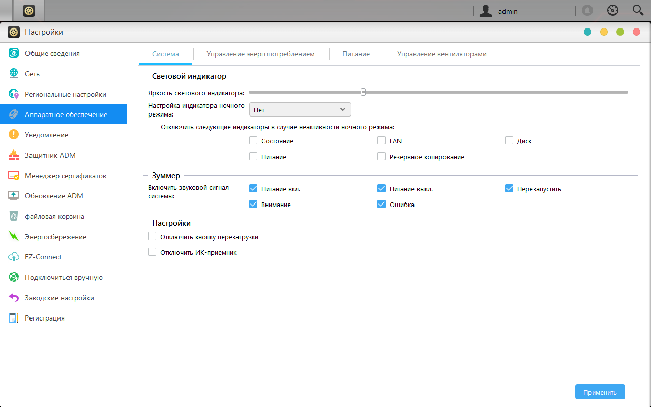 Присутствует и несколько опций аппаратного уровня. В частности это яркость индикаторов, управление звуковым сигналом, отключение кнопки сброса и ИК-приемника, энергосбережение (отключение дисков, спящий режим, расписание работы и сна), управление вентилятором.