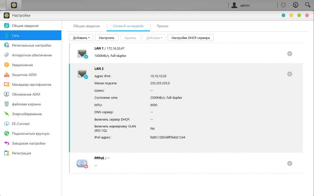 В отличие от других производителей, собственно параметры конфигурации сетевого накопителя разнесены по нескольким разделам. Прежде всего, это пункт «Настройки». Традиционно здесь есть пункт обновления прошивки (есть и сервис автоматической проверки и уведомления о новых версиях), сброса настроек (сохранение и восстановление конфигурации осуществляются в модуле резервного копирования), региональные параметры.