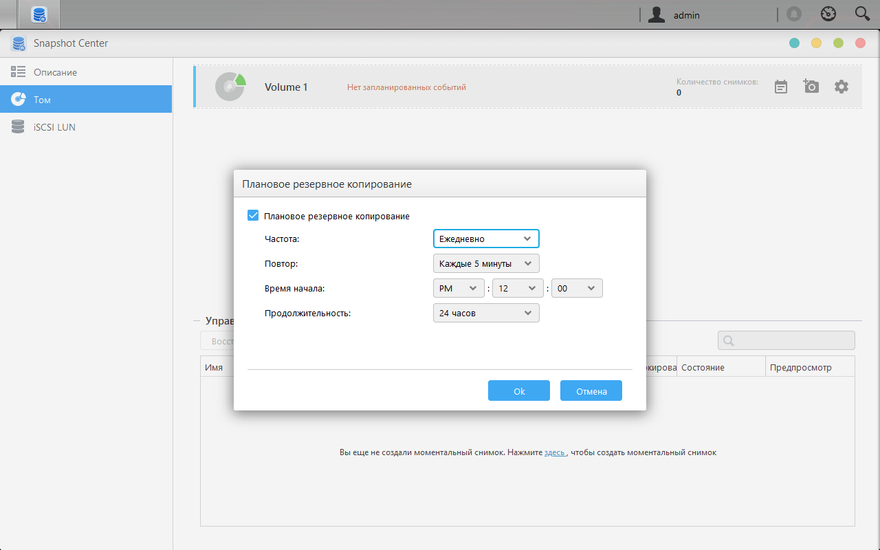 Система позволяет использовать технологию снимков (snapshot) для защиты томов и iSCSI LUN при работе с btrfs. Настраивается эта функция в модуле «Snapshot Center». Кроме ручного запуска запрограммировать расписание для каждого тома и LUN. Минимальный интервал для создания снимка составляет пять минут, максимальное число снимков — 256. Система может автоматически удалять старые снимки.