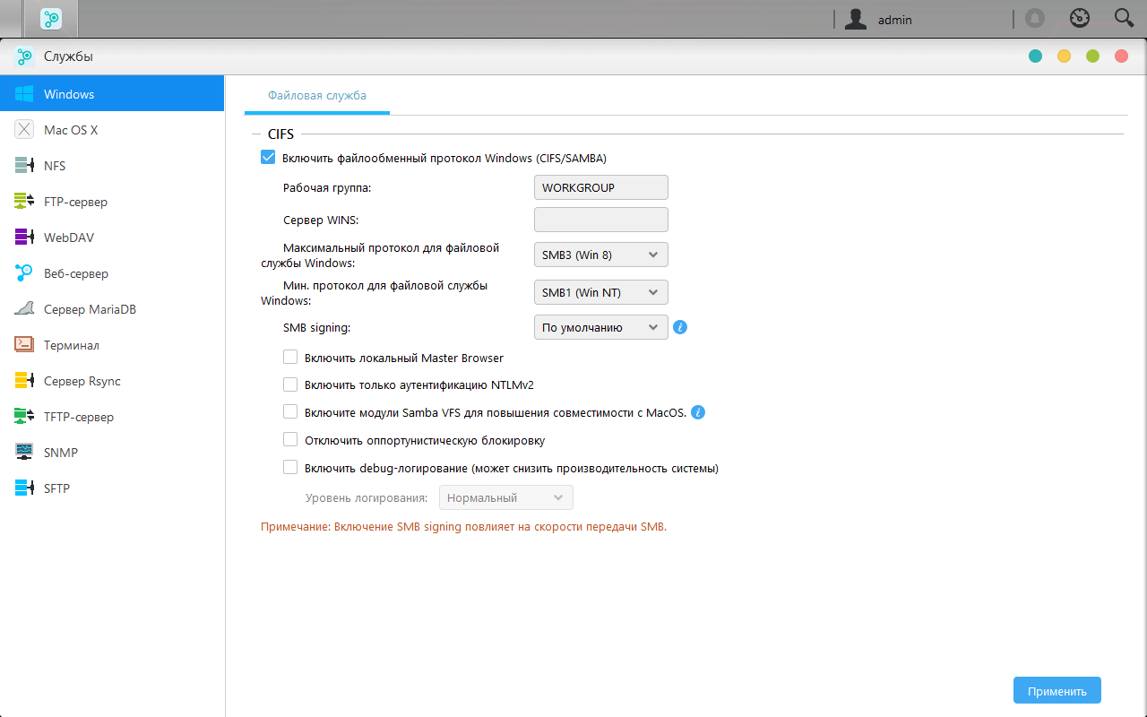 В разделе «Службы» настраиваются сетевые протоколы, включая протоколы доступа к файлам (CIFS, AFP, NFS, FTP, WebDAV, TFTP, rsync, SFTP) и дополнительные сервисы. Среди последних — веб-сервер, сервер баз данных MariaDB, SSH для доступа к консоли сетевого накопителя и SNMP для удаленного мониторинга.