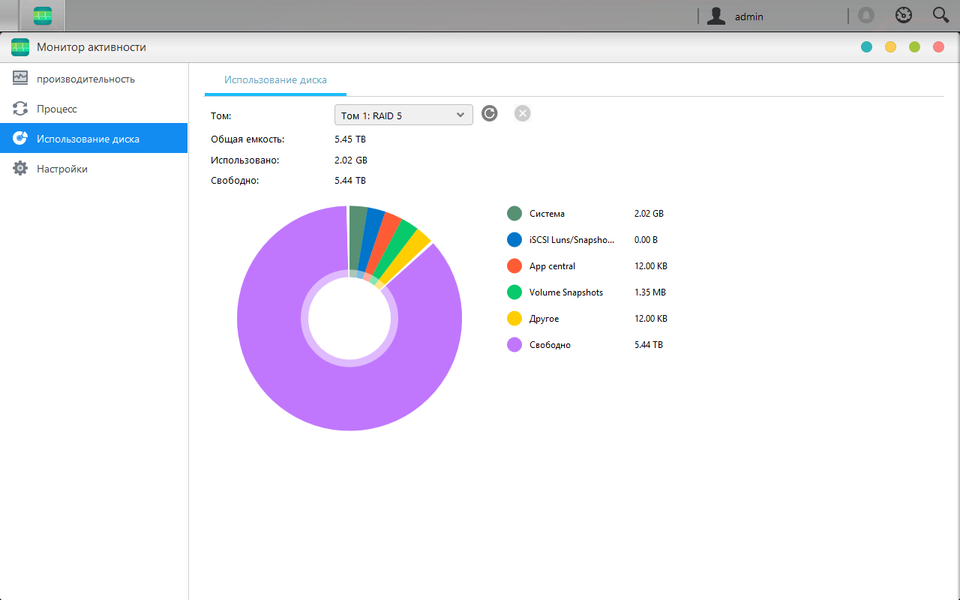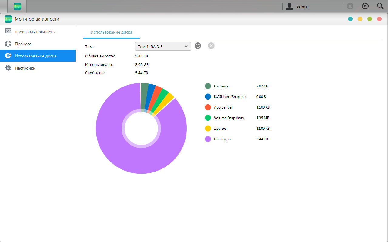 Контроль нагрузки и потребления ресурсов осуществляется в модуле «Монитор активности». Кроме привычных параметров производительности, здесь можно смотреть на текущие процессы, а также проверять занятость дисковых томов. Дополнительно можно установить триггеры для отправки уведомлений при превышении загрузки процессора и оперативной памяти.