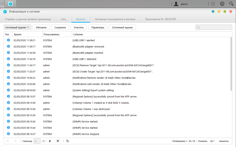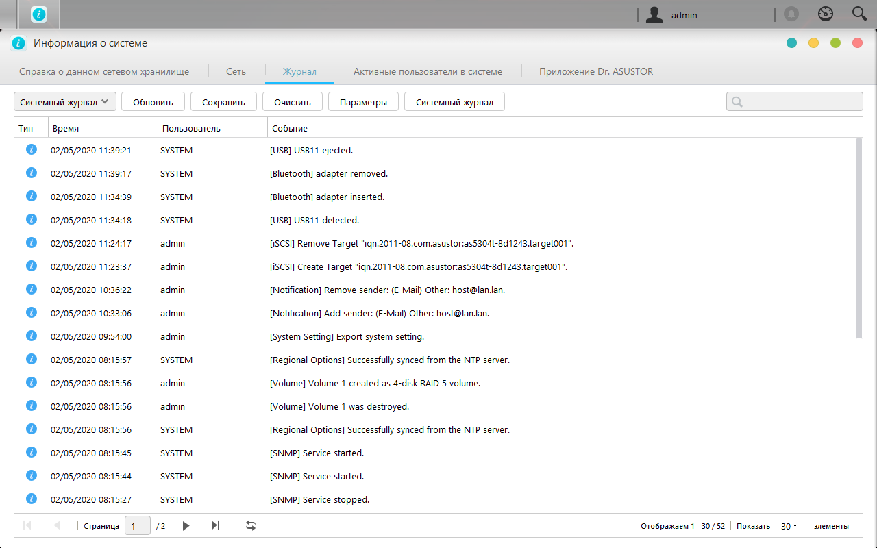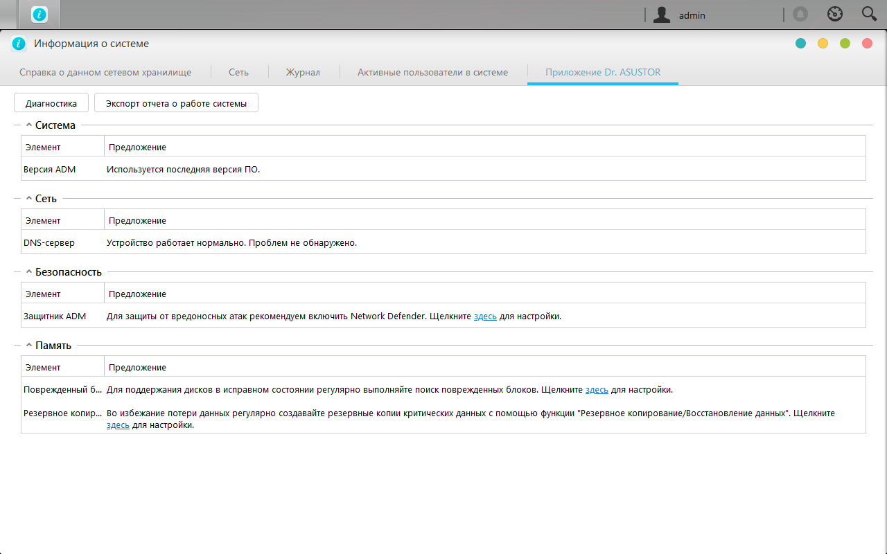 Раздел «Информация о системе» позволяет проверить ключевые системные параметры устройства, включая версию прошивки, время, сетевые адреса, просмотреть журналы событий, подключений и доступа к файлам (предварительно нужно включить эту функцию). Также здесь есть список текущих подключенных пользователей и сервис «Dr. Asustor».