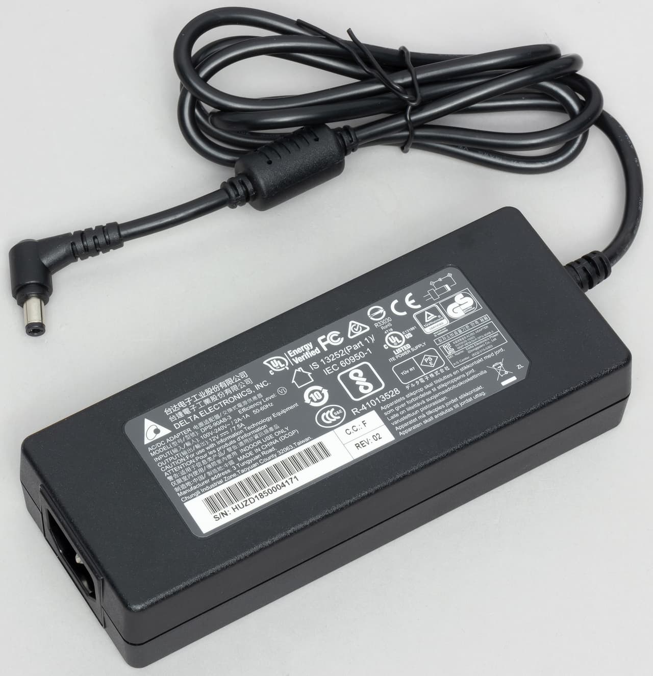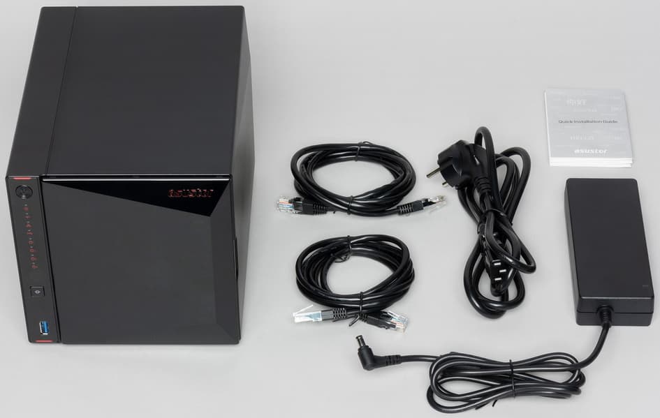 Блок питания по формату аналогичен используемым в ноутбуках. Для подключения к сети он имеет съемный кабель с обычным разъемом C14 и встроенный кабель длинной 120 см со стандартным круглым штекером (угловым) для подключения к NAS. Производитель блока питания — известный бренд Delta Electronics, а параметры — 12 В 7,5 А (90 Вт). Патч-корды — полутораметровые категории 5e.