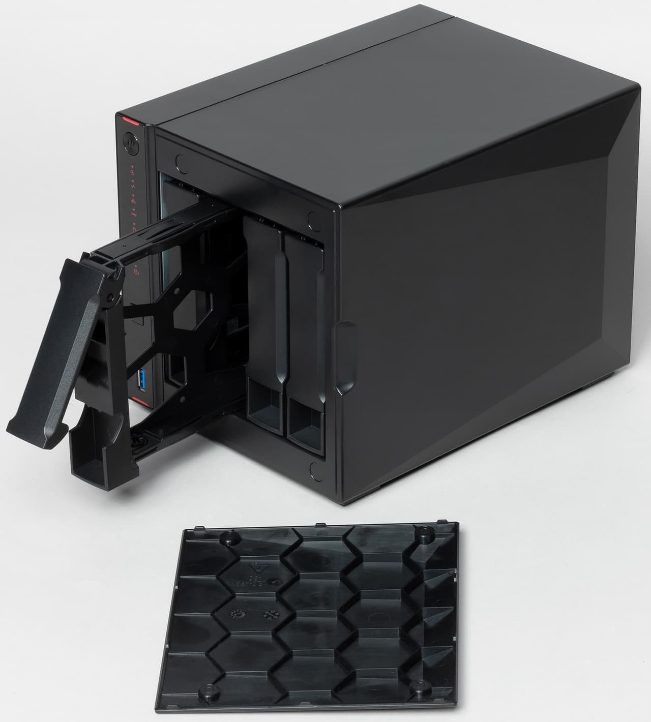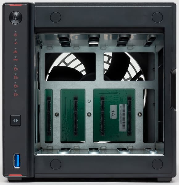 Придумать что-то новое в конструкции сетевых накопителей непросто и в большинстве случаев схема одинаковая — внутренний металлический каркас, на котором закреплена печатная плата и бекплейн для дисков, закрыт пластиковым кожухом. Этот же вариант используется и в рассматриваемой модели. Из особенностей отметим доступность слотов для оперативной памяти через отсеки жестких дисков. Так что для апгрейда не потребуется ничего разбирать. Однако этот вариант все-таки предусмотрен производителем, что может быть полезно, например, для чистки вентилятора.