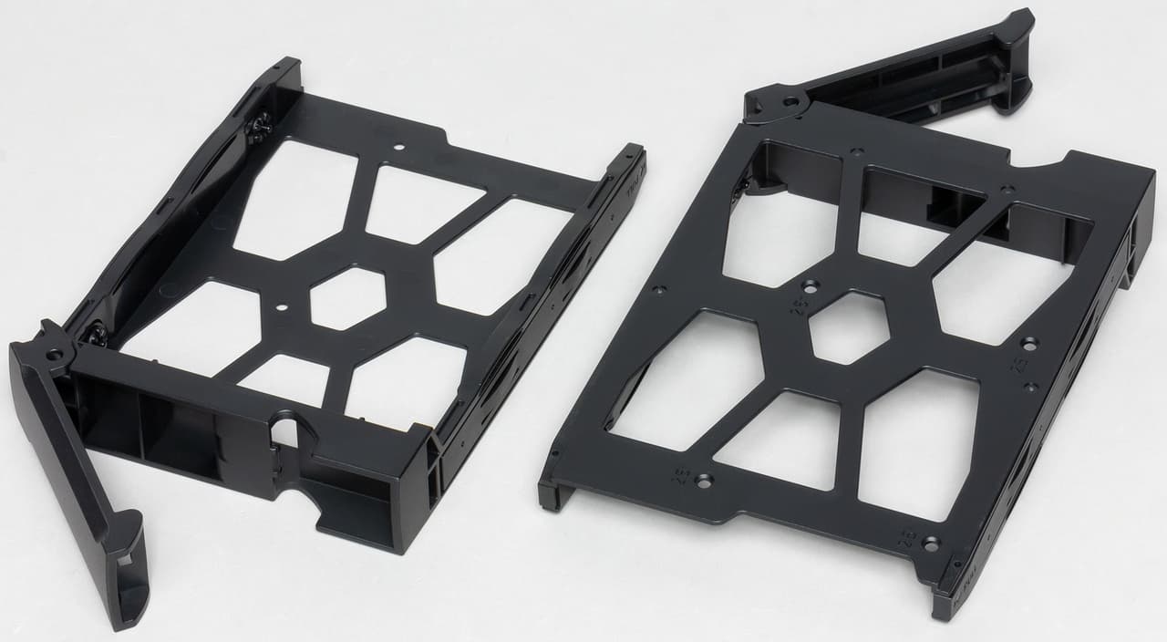 Для начала работы с сетевым накопителем потребуется хотя бы один диск или SSD. Отметим, что модели формата 3,5″ можно закрепить без использования инструментов благодаря конструкции рамок. Снижению вибрации и шума способствуют специальные резиновые вставки. Для устройств 2,5″ применяется винтовое крепление, при этом одну из полосок для 3,5″ придется удалить. Дополнительных замков здесь не предусмотрено.