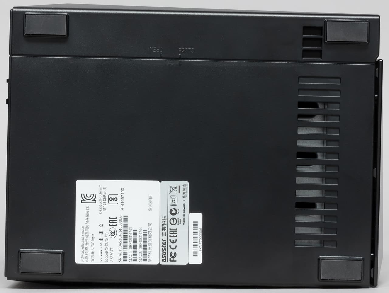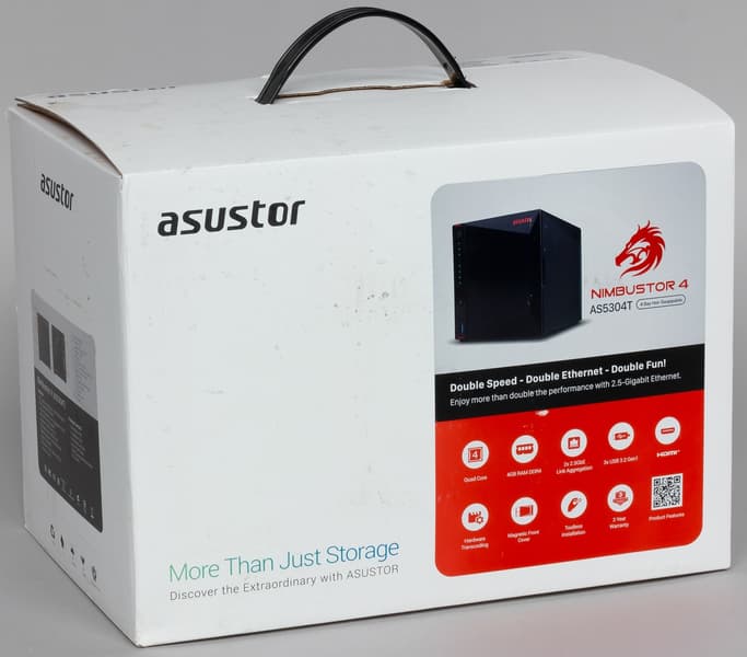 Устройство поставляется в картонной коробке с транспортировочной ручкой. Упаковка вероятно универсальная для нескольких моделей сходного формата. Так что вся информация о конкретном NAS приводится на наклейках — крупная на боковой стороне содержит фотографию, название и список ключевых особенностей, небольшая на верхней стороне — серийный номер, артикул, MAC-адреса сетевых интерфейсов и другую кодовую информацию.