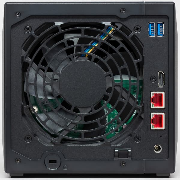 На боковых сторонах нет ничего интересного. Сзади мы видим решетку крупного (120 мм) вентилятора, два порта USB, порт HDMI 2.0а, два сетевых порта с индикаторами, вход блока питания, скрытую кнопку перезагрузки и отверстие кенсингтонского замка.