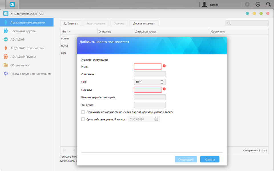 Управление дисковыми томами и томами iSCSI осуществляется в «Диспетчере системы хранения». Количество и конфигурация томов ограничиваются набором установленных дисков. Предусмотрено выделение диска автоматической замены, кэш SSD, выбор файловой системы для внутренних томов (ext4 или btrfs). Отдельно нужно отметить функцию MyArchive. Она позволяет вам использовать в сетевом накопителе жесткий диск не во внутреннем формате устройства, а с возможностью его удаления и установки в любой момент и стандартными для обычных компьютеров файловыми системами (включая NTFS, HFS+ и ext4). Данная схема может быть интересна в случае необходимости иметь файловый архив в формате офлайн. Заметим, что при этом в NAS должен присутствовать хотя бы один «обычный» том, то есть дисков MyArchive в рассматриваемой модели можно подключать до трех. Кроме того, при использовании ext4 файлы на этом томе можно зашифровать. При необходимости поддержки exFAT требуется купить лицензионный ключ.