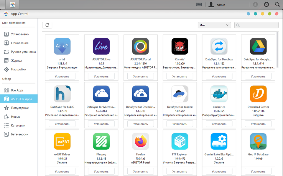 Для установки дополнительных программ в ADM используется каталог App Central. На момент подготовки статьи в нем присутствовало более трех сотен программ от Asustor и сторонних разработчиков. Для удобства они сгруппированы по категориям. Приложения могут автоматически обновляться, есть возможность установки программ из предварительно загруженных файлов пакетов. Ознакомиться с актуальным составом каталога для рассматриваемой модели можно по ссылке. Наиболее интересные и полезные программы включают в себя: