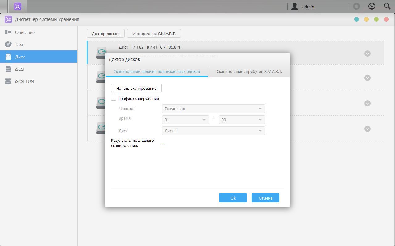 Для контроля за состоянием накопителей предусмотрена проверка атрибутов SMART, контроль температуры и сканирование поверхности по расписанию. Реализована здесь и поддержка IronWolf Health Management для дисков Seagate.