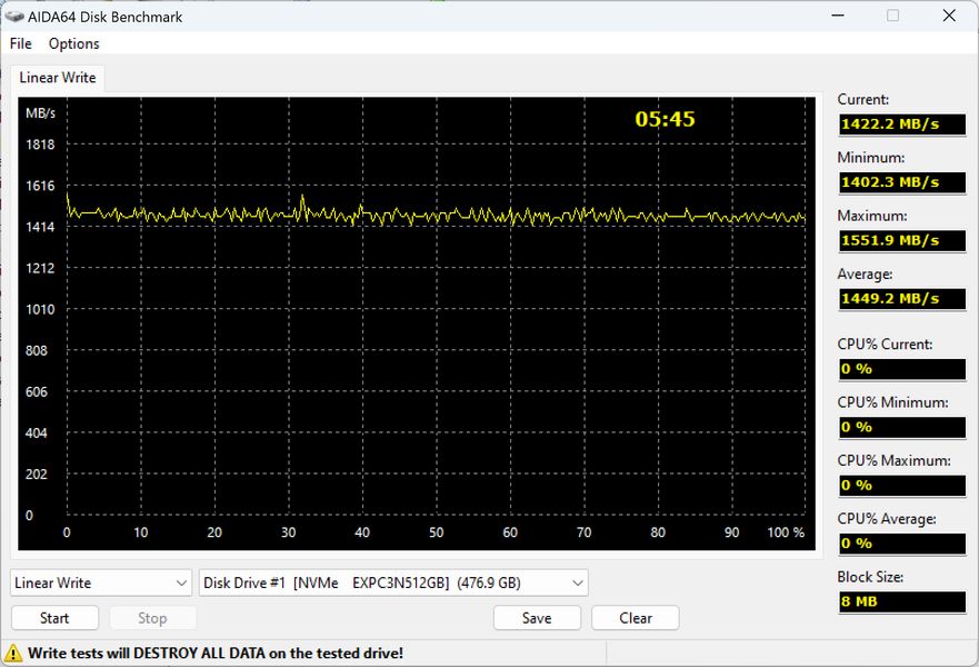 Поддержка SLC-кэширования в Archon нашлась. Но это малюсенький статический кэш, который на практике мешать никак не будет. Основной объем прописывается непосредственно в TLC-массив на скорости порядка 1,2 ГБ/с. Что ниже положенного по спецификациям, но, в очередной раз повторим, методики определения официальных характеристик разные (и это не AIDA64), да и реально это всё равно солидный запас для современной техники.