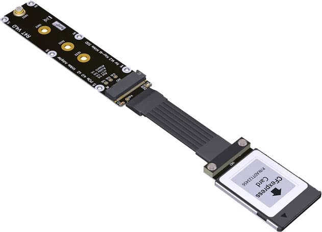 Базируется эта идея на том, что сам по себе формат Type B, унаследованный еще от XQD, по современным меркам достаточно габаритный — по всем трем измерениям. Твердотельный накопитель самого распространенного вида M.2 2280 в такие размеры не впихнешь, а вот M.2 2230 помещается как раз. Проблем с интерфейсом нет: и там, и там PCIe, причем в картах линий меньше. Так что нужен просто механический переходник, выпуск которых давно освоили китайские компании.