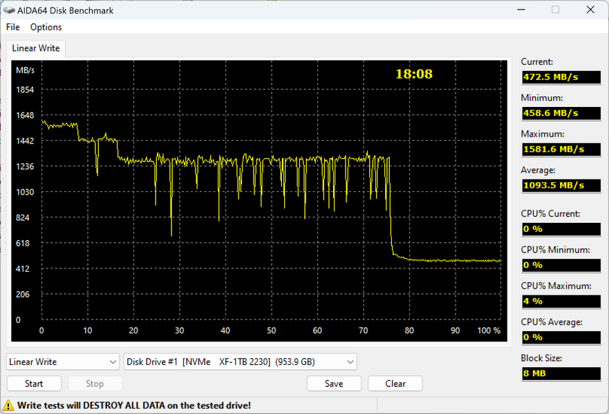 Думаем, можно обойтись одним комментарием к обеим диаграммам. Операции чтения — задача простая, поэтому оба раза мы просто измерили пропускную способность PCIe Gen3 x2 — то есть внешнего интерфейса. Получили немного разные результаты, но для разных режимов это нормально. Да и для разных носителей тоже. Плюс-минус два лаптя от Солнца за счет немного разных способностей в «нормальном» режиме, чуть-чуть сказывающихся и в «ограниченном».
