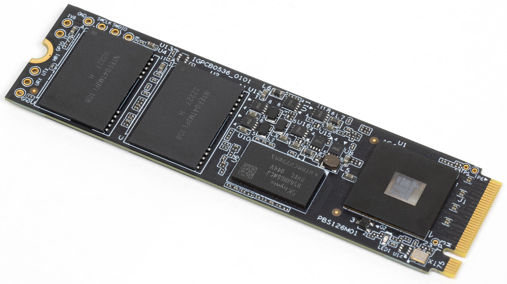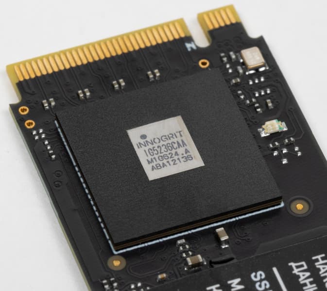 Также на самой плате обнаруживается зеленый светодиод активности, при установленном радиаторе не видимый. Что же касается дизайна, то это типичная двухсторонняя разработка InnoGrit. Но в этом нет ничего удивительного — разработчики контроллеров и референсные дизайны делают, и готовые прошивки делают, некоторые так и вовсе партнерам прямо готовые SSD и отгружают, так что многообразие на рынке куда меньше, чем иногда кажется. Единственной компанией, никогда не следовавшей этим тенденциям, был такой мастодонт, как Marvell — и найдите сейчас продукцию на контроллере этого производителя (за исключением, разве что, Samsung PM9B1, что вдвойне забавно — ведь в большинстве накопителей Samsung использует собственные контроллеры).