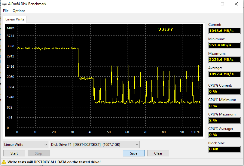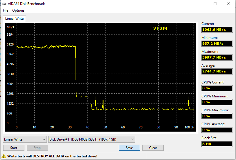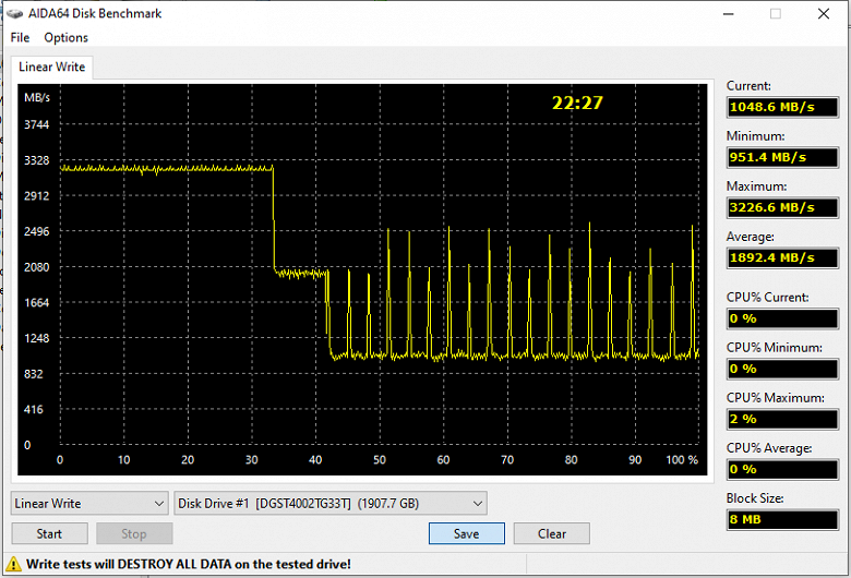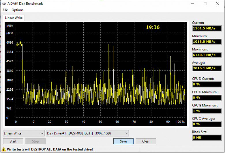 Поскольку и однопоточная запись на деле внутри превращается в многопоточную, особой разницы в результатах этих сценариев нет. Разве что падение производительности еще сильнее, хотя по результатам AIDA64 можно было ожидать строго обратного. Однако по этому поводу все уже сказано выше — повторяться незачем. Слишком быстрыми стали современные топовые SSD — настолько, сколько в ряде случаев и бенчмарк переварить не может.