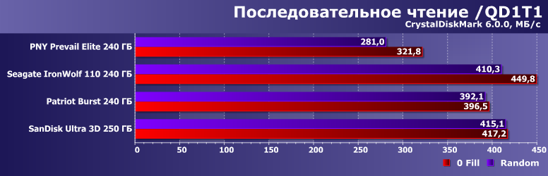 Кого будем тестировать? Главный герой — Seagate IronWolf 110 емкостью 240 ГБ, к которому мы снова добавим «историческую» модель на SandForce SF-2281 и eMLC-памяти Intel той же емкости, а именно PNY Prevail Elite. Для иллюстрации разницы подходов SandForce и Phison нам пригодится Patriot Burst на те же 240 ГБ — в нем используется Phison S11 и 96-слойная память TLC NAND Toshiba BiCS4 (для чистоты эксперимента лучше бы подошла 64-слойная BiCS3, как в IronWolf 110, но найти сейчас такую конфигурацию уже сложно). А эталонной точкой отсчета послужит SanDisk Ultra 3D 250 ГБ: контроллер Marvell 88SS1074 хитрым трюкам со сжатием не обучен, а память — та же BiCS3. Впрочем, упирать на идентичность памяти в сегодняшнем тестировании мы не будем (даже когда оно есть), поскольку SanDisk и Patriot (как и положено современным накопителям) поддерживают SLC-кэш, а вот Seagate и PNY обходятся без него. Так что в первую очередь нас будет интересовать зависимость каждого накопителя от данных и сравнение тенденций, а не абсолютных результатов.