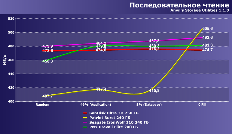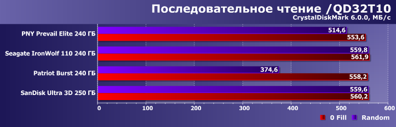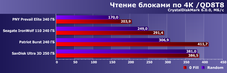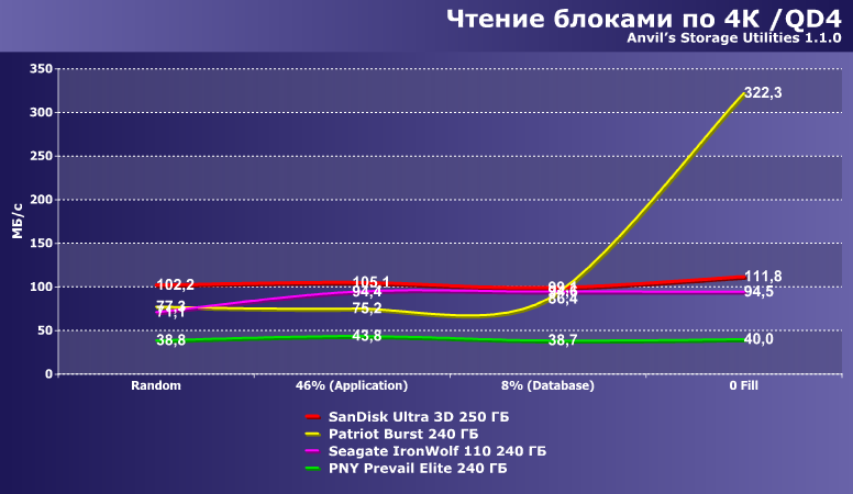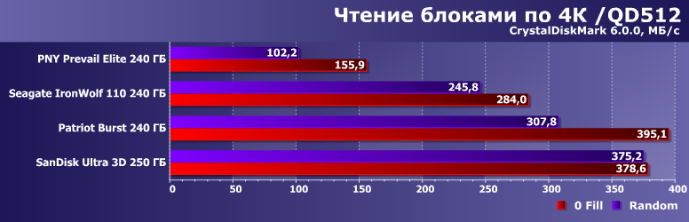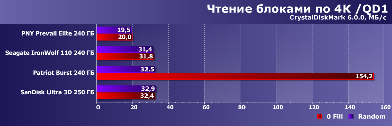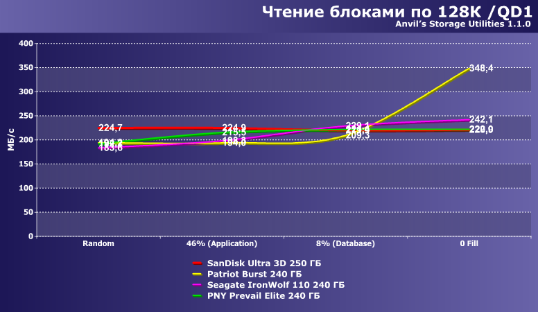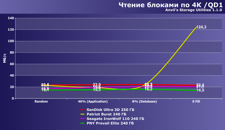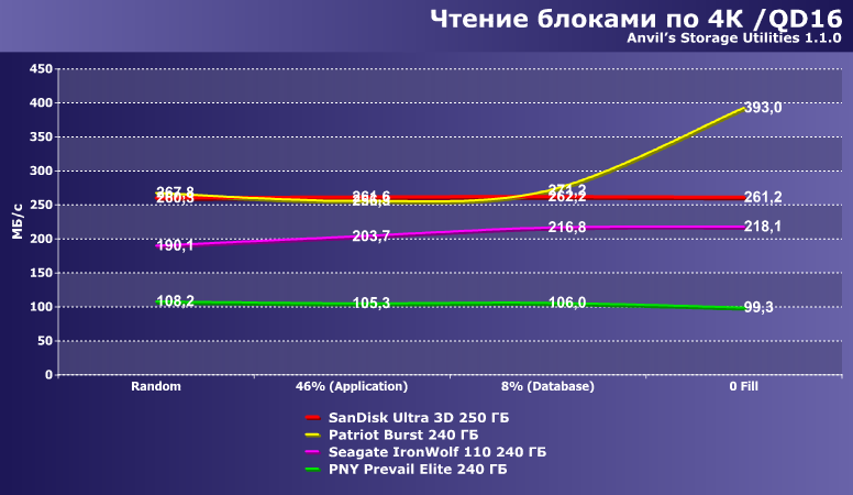 «Эталонному» SanDisk Ultra 3D все равно, что читать — как и должно быть. SandForce и его наследникам — не все равно: порядка 40 МБ/с на нулях мы получаем дополнительно. Почему не больше? Потому, что данные все равно нужно читать, обрабатывать и «выдавать» на интерфейс. Но, в любом случае, хуже не становится. Особенно если говорить про «старые» накопители — в те годы скорость чтения была сама по себе более низкой, так что и прирост от подобных ухищрений в относительном исчислении более весом. Patriot Burst теоретически тоже должен демонстрировать увеличение производительности, а практически «потолком» тут можно считать собственные возможности контроллера: вот столько и не более он может выдавать на интерфейс в однопоточном режиме.