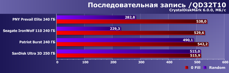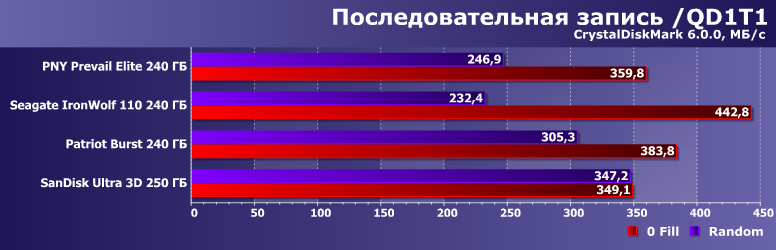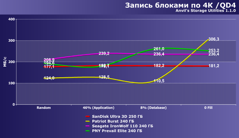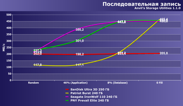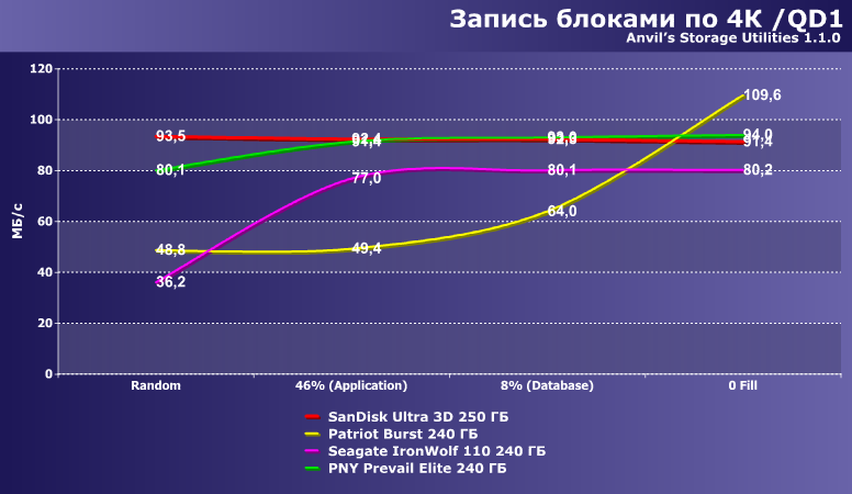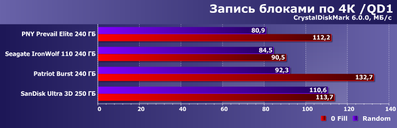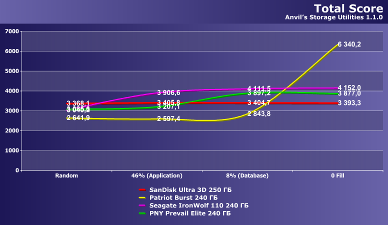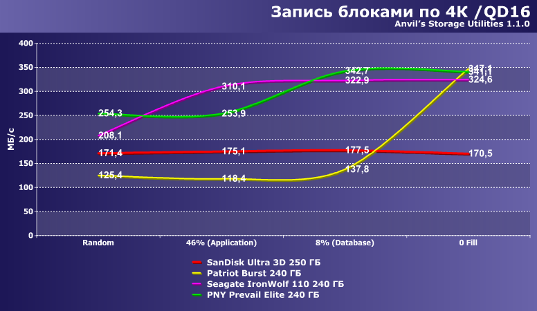 И в таком «предельном» случае он тоже бодро наращивает производительность и выходит в лидеры. Оба SF — скромнее в обоих смыслах. А, главное, не так уж в этом случае что-то улучшать и требуется — SanDisk Ultra 3D на уже достаточно старом контроллере от типа данных не зависит и все равно работает быстро. В полтора раза быстрее, чем IronWolf 110 на той же памяти.