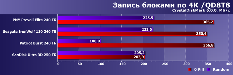 Скорость записи меняется в куда более широких пределах. Тройка накопителей на случайных данных работает одинаково, затем двое начинают ускоряться по мере увеличения количества нулевых данных. S11 вообще медленнее прочих — но когда нулей «много», то проскакивают уже и заполненные ими целиком блоки, так что производительность повышается до уровня SanDisk Ultra 3D. А на чистых нулях он и вовсе догоняет Seagate с PNY, благо для всех троих это практически одинаковый (в данной программе) и идеальный случай.