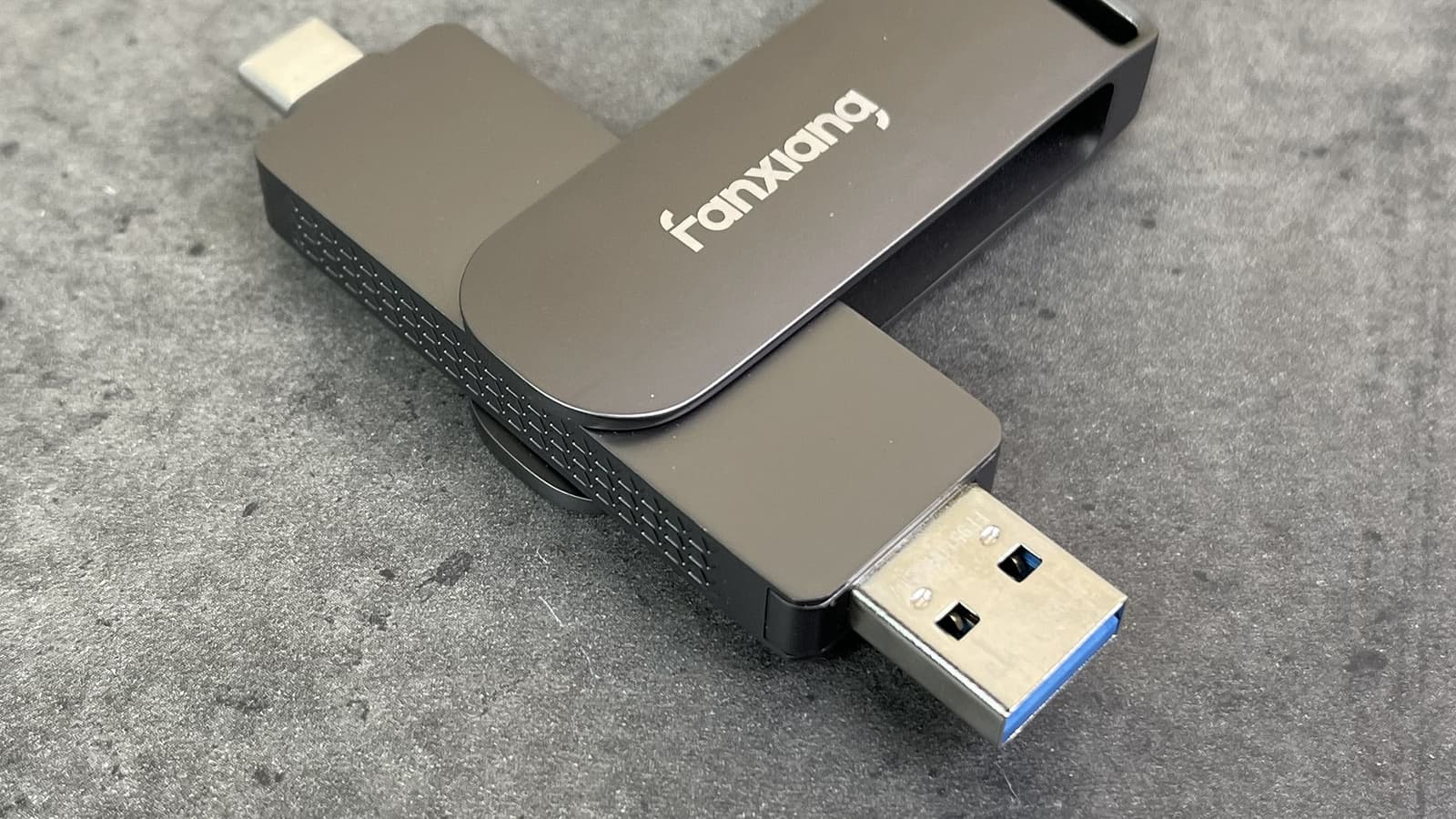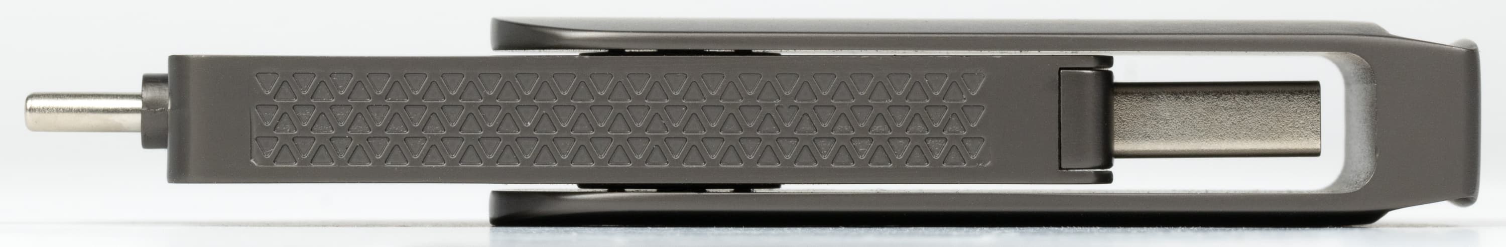 Флэшка имеет размеры 85×20×12 мм, что солидно, но еще терпимо. Напомним, что модели с отделяемым кабелем обычно еще крупнее, да и сам по себе кабель в сложенном виде занимает места столько же, сколько такая флэшка, а то и больше. Другой вопрос, что кабель-удлинитель может пригодиться и в этом случае — из-за внушительной массы 53,6 г. оставлять флэшку торчать прямо в порту чревато. Особенно если говорить про мелкий Type-C с его сложной многоконтактной структурой. А именно он тут является основным — Type-A на другом конце корпуса служит лишь для совместимости, поскольку полную скорость через него получить в принципе невозможно.