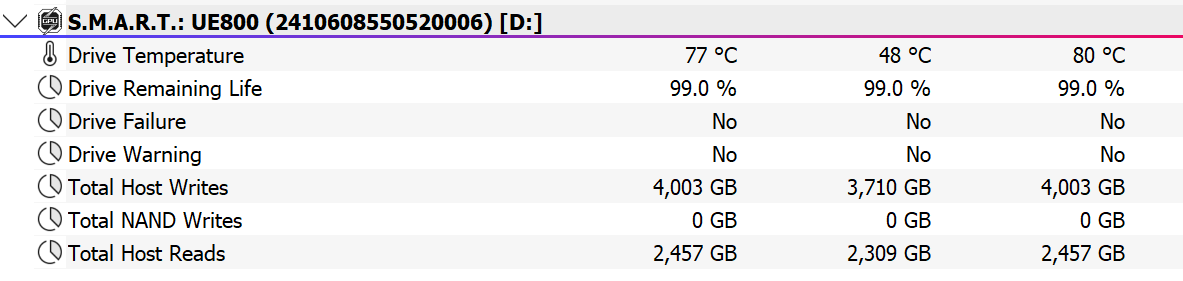Мониторинг показывает то, что и должен. Максимальная температура составила 83 градуса — это как раз тот порог, от которого контроллер старательно отталкивается всеми силами. Впрочем, скорости всё равно остаются высокими, но сколько можно проработать в таком режиме — неизвестно: вряд ли он пойдет на пользу компонентам. С другой стороны, и 80 градусов, которые достигались даже и старыми флэшками, ничуть не менее серьезно, а в полном смысле слова холодных устройств на этой платформе не бывает. К тому же, при обычном использовании вероятность того, что придется записывать сразу целый терабайт, а потом еще его и читать безо всякой паузы, исчезающе мала. Так что вердикт простой — такие флэшки действительно могут работать быстро. И делать это достаточно долго, чтобы полностью решить возникающие у пользователя задачи. Улучшить результаты можно было бы вместе с улучшением охлаждения, о чем производитель не позаботился — именно потому, что и так, в принципе неплохо получилось, а при использовании режима Gen2 владелец может вообще никаких неудобств и не заметить. Но для компонентов они есть и в таком режиме — просто не успевают вылезти наружу.