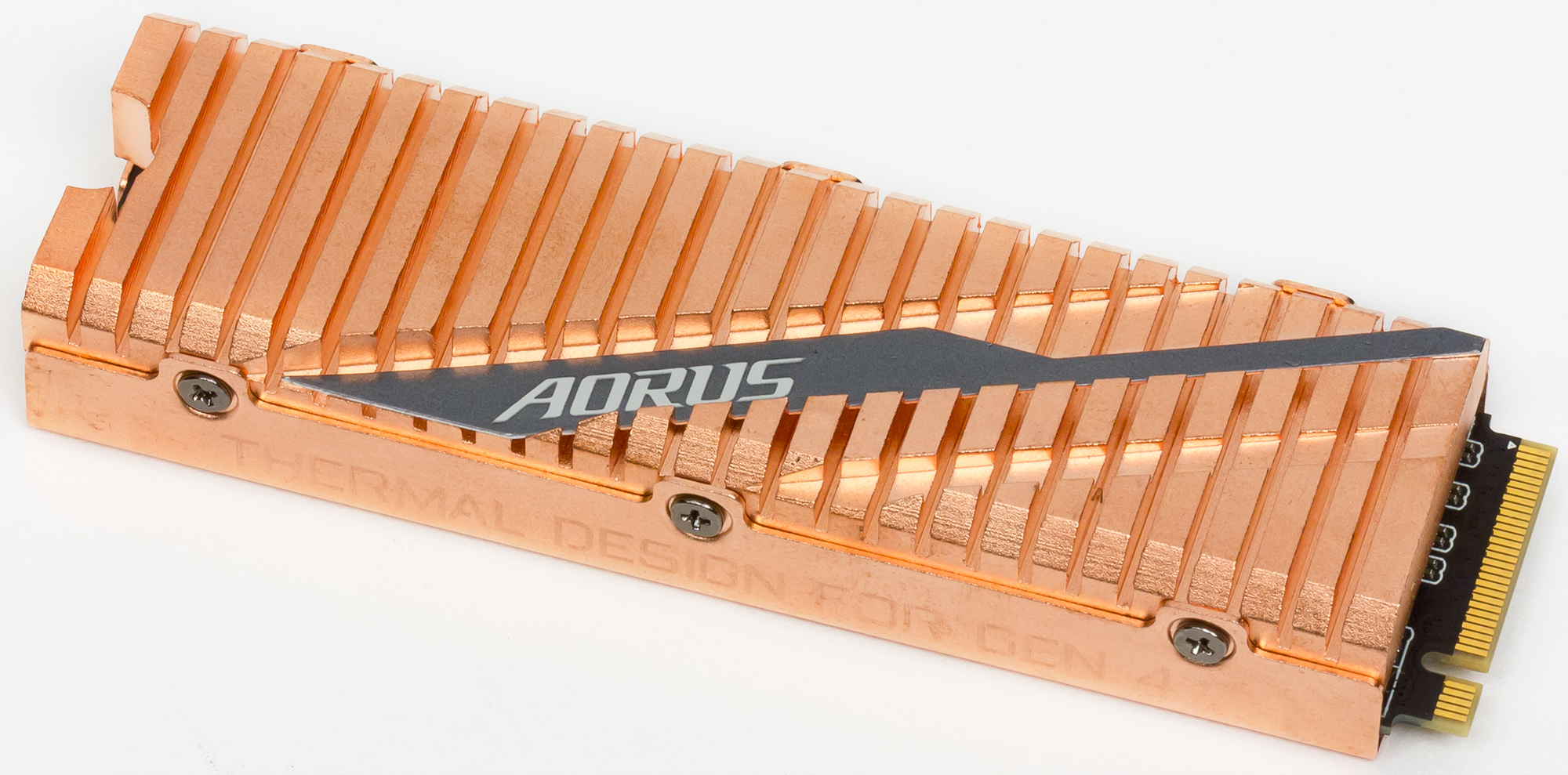 А радиатор — есть: он представляет собой массивную медную(?) конструкцию, причем плату «обхватывает» с двух сторон. Учитывая, что «рабочими» у этих накопителей являются обе стороны, это весомое преимущество перед «штатными» системами охлаждения материнских плат. Собранная «слоеная конструкция» фиксируется шестью винтиками и имеет размеры 80,5×11,4×23,5 мм: тоже, в общем-то, солидно.