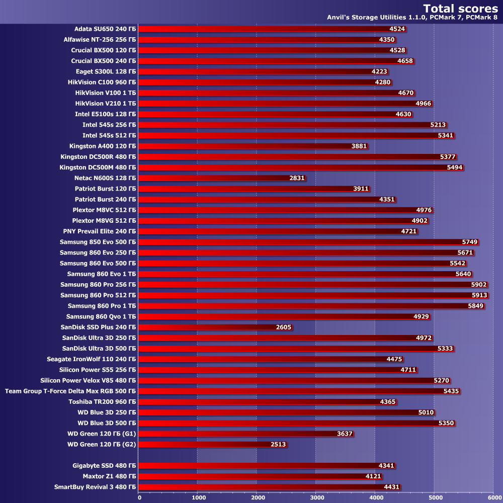 В качестве таковых мы взяли пару моделей из предыдущего тестирования: на базе все того же Phison S11, но с 240 ГБ памяти BiCS4, как в Gigabyte и Maxtor (Patriot Burst), и 256 ГБ 96-слойной 3D TLC NAND Micron (Silicon Power Slim S55) — прошивка сходная с попавшим к нам в руки экземпляром SmartBuy Revival 3 480 ГБ. Кроме того, возьмем три модели среднего класса: Intel SSD 545s, Samsung 860 Evo и WD Blue 3D емкостью 250/256 ГБ. Выбор между «середнячком» и бюджетником на полтерабайта стоит на самом деле нечасто, поскольку слишком уж различается цена на них. А вот в таком раскладе сравнение совершенно практическое: выбор между уровнем выше и емкостью больше за сопоставимые деньги.
