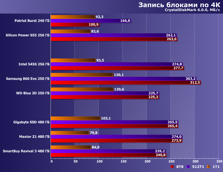 Что касается записи, тут у всех результаты не блестящие — «середнячки» всяко быстрее. Криминала на первый взгляд не видно. Но если задуматься, то кэш на 40% от свободного места для Silicon Power S55 и SmartBuy Revival 3 из-за разницы в емкости это две большие разницы: в этом тесте на накопителях занято не менее 160 ГБ. Соответственно, когда общая емкость достигает 480 ГБ, на SLC-кэш остается порядка 100 ГБ — и этого достаточно. А 240-256 можно считать «забитыми».