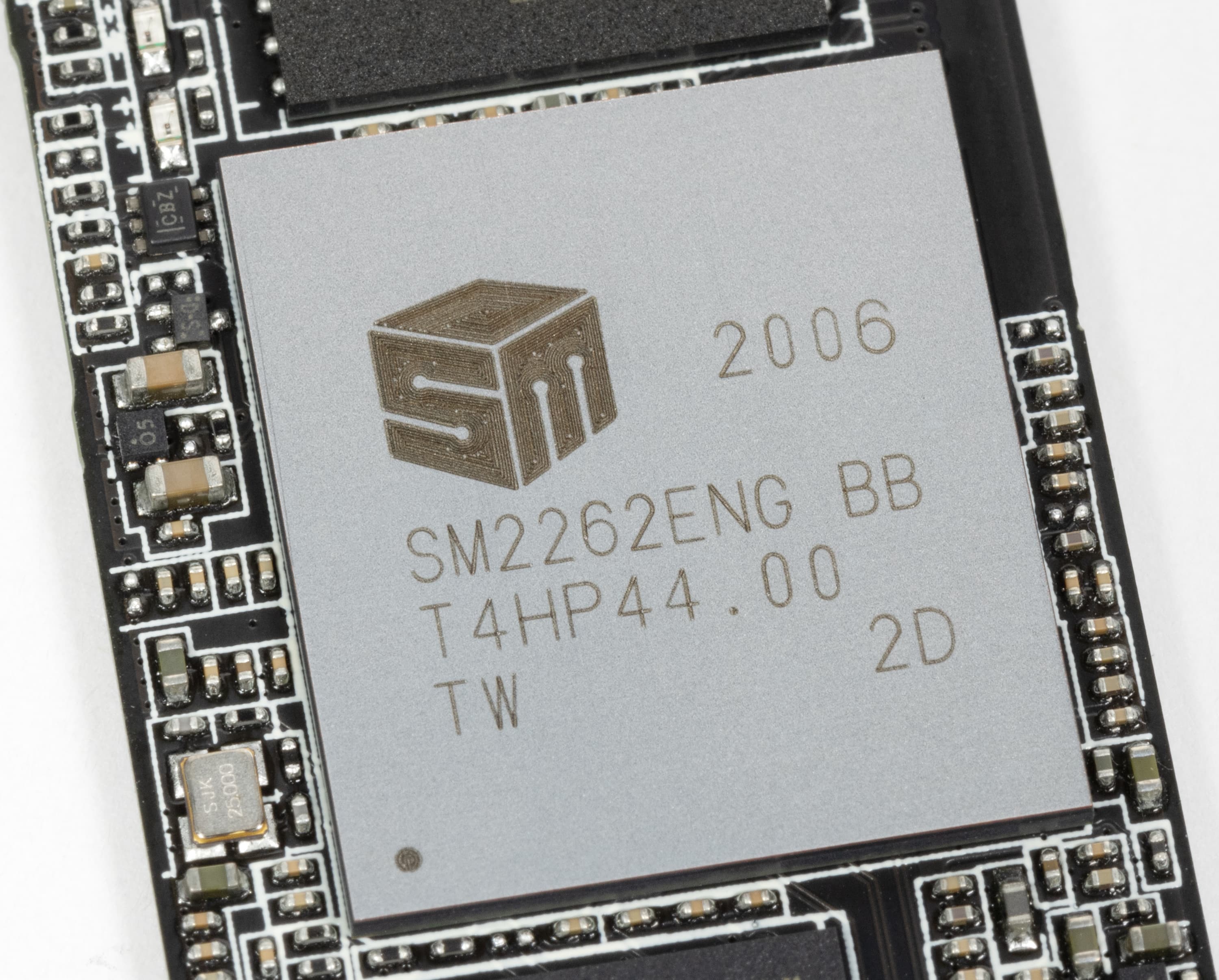 Сам SSD обычный — как уже не раз было сказано, что-то придумать в случае M.2 2280 вообще невозможно. Внимания заслуживает разве что двухсторонний монтаж, да надписи на плате, наталкивающие на мысль об использовании контроллера Silicon Motion SM2262EN.