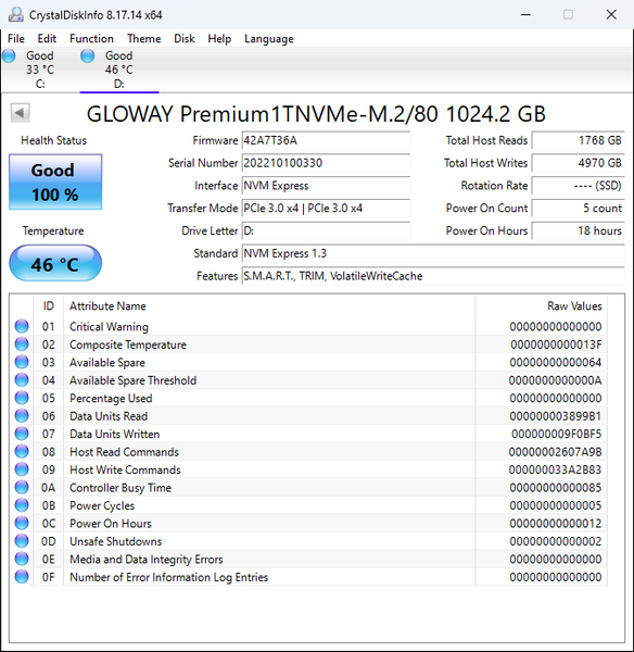 | Gloway Premium SSD 1 ТБ (PCIe Gen3) | 1670,1 | 1332,6 |