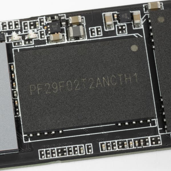 И, действительно, именно он и скрывается под наклейкой. Напомним, что это топовое решение компании времен PCIe Gen3 — немного ускоренная версия SM2262. И прямой предшественник SM2264 под Gen4 — который нас совсем недавно смог приятно удивить. Концептуально модели похожи — мощные (на момент разработки естественно — для каждого свой) восьмиканальные решения. Без DRAM не обходятся — здесь она есть (производитель не обманул), причем в количестве полного гигабайта и двумя чипами, что немного ускоряет ее связь с контроллером. И флэш-память с маркировкой, перекликающейся с родной от Intel — что не так уж и часто встречается у китайцев. Правда флэш довольно старый — 64-слойный TLC с кристаллами по 512 Гбит (B17A), лучшие годы которого кончились года так три назад. Но в целом очень похоже на то, какими были топовые модели на SM2262EN того времени. За одним исключением — при емкости терабайт и менее в них чаще встречался B16A с кристаллами по 256 Гбит, что позволяло лучше нагрузить работой все восемь каналов контроллера. Тут же чередование лишь двукратное, что производительность должно немного ограничить. Вот MAP1001 в этой модели встречался с 64-слойной памятью YMTC с кристаллами по 256 Гбит, но нам такая модификация уже не досталась: где-то с весны кончилась.