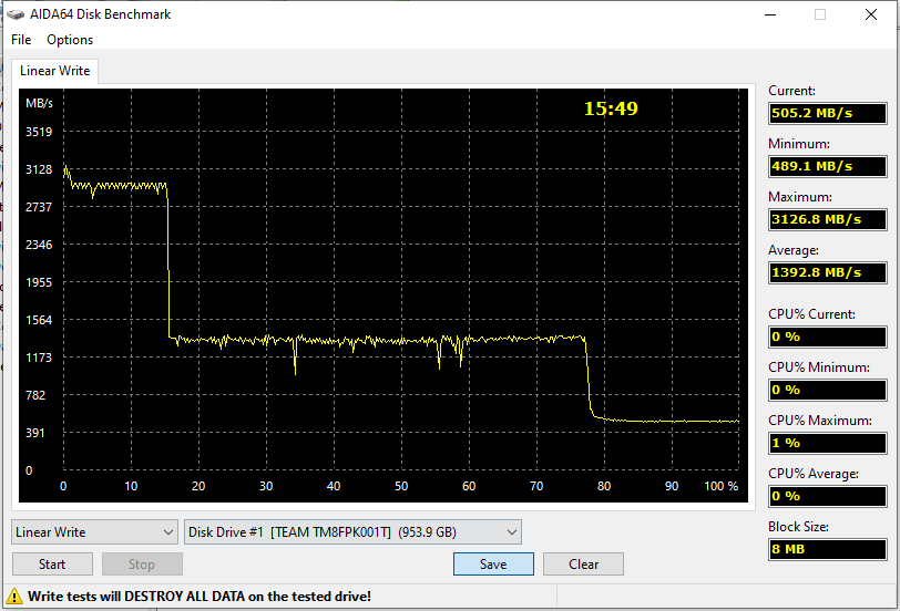 Для сравнения более современный Team, формально более низкого класса, рисует нам кривую почти такого же вида. Только вот скорость записи в SLC-кэш уже способна перевалить за 3 ГБ/с, а в режиме прямой записи получается строго выше гигабайта в секунду. Разве что конечное «разгребание» кэша на всё тех же 500 МБ/с — но, будь контроллер помощнее, и тут могло бы получиться больше.