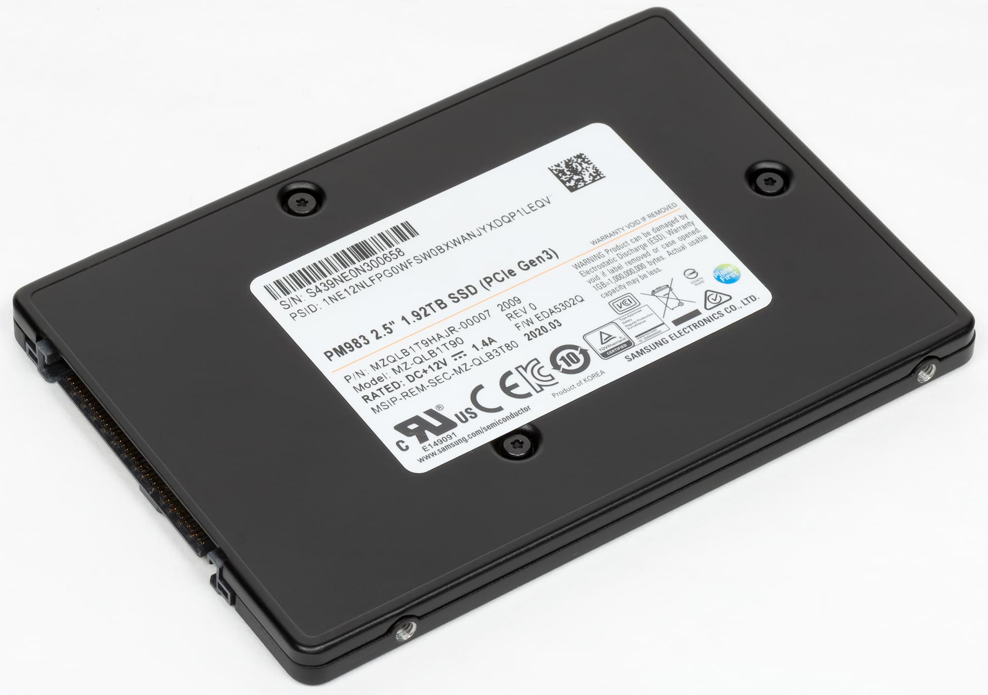 До этого -- шли вверх. Теперь попробуем вбок. Взяв модель корпоративного семейства, чем сразу убьем пару зайцев. Позиционирования можно не бояться применительно к цене — на самом деле сейчас Samsung уже постепенно переносит фокус на новые устройства типа PM1733 с PCIe 4.0, так что «устаревший» PM983 за последние пол-года подешевел до уровня тех же SSD на Phison E16 и даже ниже. Насчет «железной части» беспокоиться тоже не приходится — на деле здесь используются те же контроллеры и память, что и в бытовых линейках Samsung 970 Evo / Evo Plus. Емкость немного ниже за счет большего резерва — что позволяет, в частности, рассчитывать на уровень 1,3 DWPD, т. е. производитель «разрешает» перезаписывать накопитель даже не каждый день, а почти полтора раза в день (правда в течение не пяти, а трех лет). Кроме того, в этих моделях реализована аппаратная защита от сбоев питания (PLP).