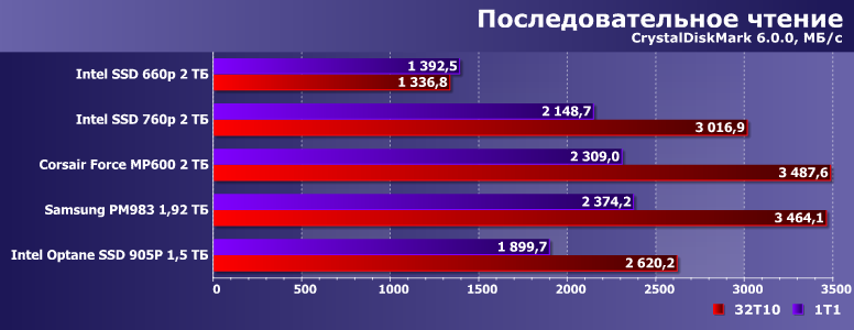 Что может быть проще и понятнее последовательных скоростей? Которые на практике редко оказываются востребованными — а вот «мериться» ими до сих пор принято. Тем более, что и производители такой спорт поощряют — благо им это ничего не стоит. Особенно если говорить о накопителях на NAND-флэш и чтении данных, которое давно уже начало «упираться» в контроллеры — а затем и во внешний интерфейс. Для SATA это давно пройденный этап, но и переход на PCIe 3.0 x4 оказался лишь временной передышкой — его возможности тоже уже выбраны досуха, так что возникла необходимость перехода на PCIe 4.0: иначе результаты и не улучшишь. Хорошо видно, правда, что и тут не все гладко — максимум для SSD выжимается на многопоточных операциях (вдвойне синтетичных), а скорость однопоточного чтения еще можно (и нужно!) увеличивать даже применительно к топовым SSD, но и это постепенно делается. А вот 905Р в таковом качестве выглядит как бледный родственник — производительность сдерживают контроллеры четырехлетней давности, еще и «оптимизированные» под серверные нагрузки, где на последовательные скорости внимание обращать не принято.