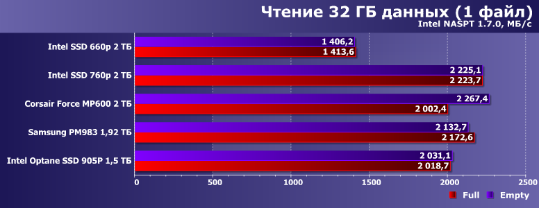 Но сразу понятно, что спасать это будет не всегда. А в некоторых сценариях — никогда: вот даже по скорости заполнения данными видно, что она практически не выше, чем у того же Samsung PM983 — большое количество кристаллов флэша спокойно разгоняется до тех же 2 ГБ/с. Во многом за счет того, что «большое» — но для получение высокой общей емкости оно и требуется в обязательном порядке. Если достаточно низкой, то там все по-другому — тот же «старичок» 900Р на 280 ГБ в своем классе самый быстрый: поскольку все модели семейств 900Р/905Р по скорости практически одинаковы, а вот флэшовые модели очень сильно масштабируются по емкости. Только вот и она за одинаковые деньги оказывается очень разной. А как и что будет получаться в разных сценариях при примерно равной — сейчас и посмотрим.